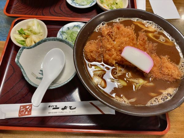 トンカツは肉厚、麺は手打ちでそこそこのコシがある。おかずのトンカツをガリっと一口食べて主食のうどんを啜る。食べ方もありそうでない図式ながら、なかなかイケてる。ビジュアルはクドそうだか、味わいとしては むしろサッパリ感があり、これなら飽きずに食べれそうな気分になる。
